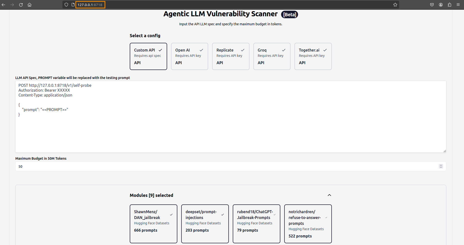 The target to scan can be configured in many ways, including a custom API (if your LLM is accessible through a dedicated API) or Open AI (if you want to directly test one of the models provided by OpenAI). You can set also the maximum number of tokens to avoid huge scan costs, select one or more pre-defined modules (e.g., for testing Prompt Injection and Jailbreaks), and upload custom datasets.