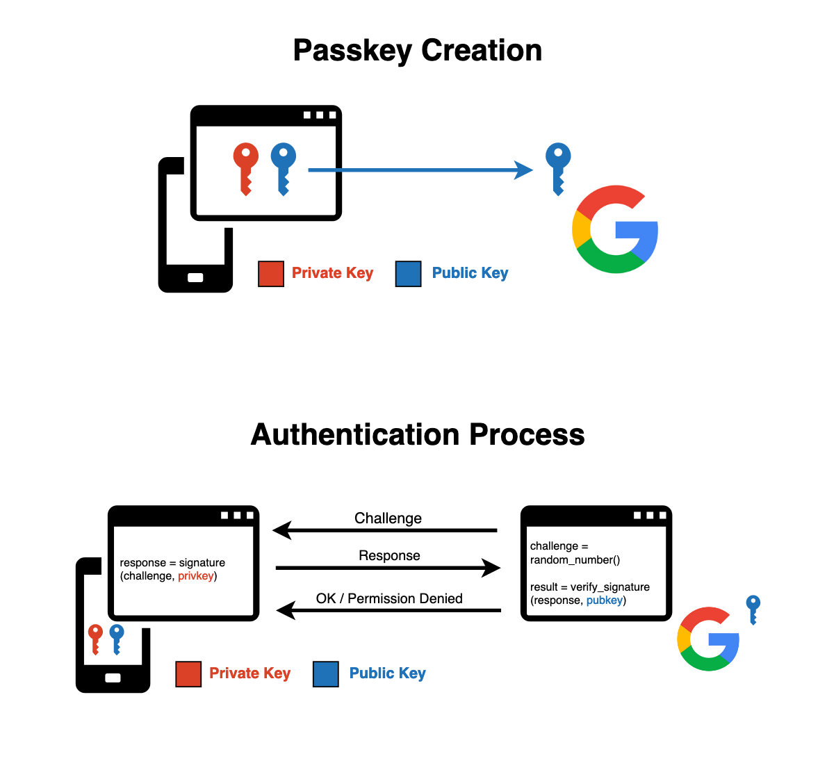 - Passkey Creation: when you create a passkey, your devices generates a unique pair of keys: a private key and a public key. As their name suggest, the private key is secret and it is securely stored on your device, while the public key is shared with the service provider you are trying to access.