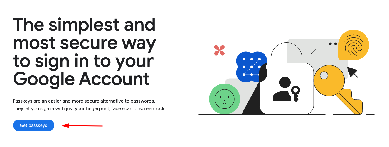 Now that you should be familiar with passkeys, it's time to create your first passkey for your Google account. Let's start! First of all, go here and click on "Get passkeys", then sign in into your Google account, click on "Create a passkey" and confirm the creation of the passkey on your device.